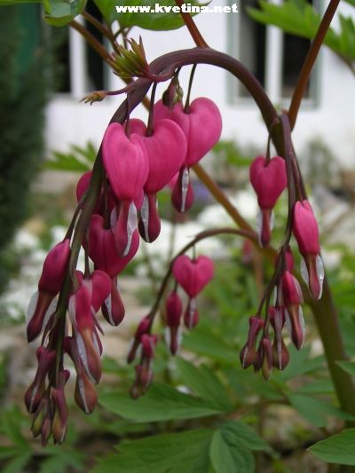 Vytrvalá, 30 až 90 cm vysoká bylina. Lodyha přímá, lysá, někdy načervenalá. Listy 2 až 3 trojčetné, řapíkaté, lysé, lístky obvejčité, zubaté. Květy v jednostranných obloukovitě ohnutých hroznech v počtu 5 až 15, nící, srdcovitého tvaru, zploštělé, vnější korunní lístky na bázi vakovité, s nazpět ohnutou ostruhou, červeně růžové, zřídka bílé, vnitřní vyčnívají z květu. Kvete v květen až červen.