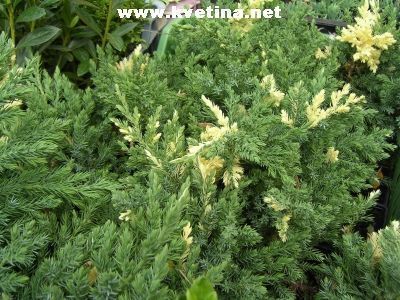 Juniperus davurica 'Expansa Variegata' - Jalovec davurský. Keřový, poléhavý, hustý zelený, lehce namodralý s žlutými skvrnami - panašovaný.