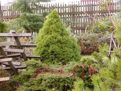 Picea glauca "Conica" /Picea albertiana conica/ - Smrk sivý ( bílý ) konický. Široce špičatě kuželovitý, uzavřený hustý, světle zelený, zakrslý. Jehlice krátké, měkké. Roste velmi pomalu. Výška 2-4m, šířka 2m. Nenáročný na stanoviště, roste v každé písčito humózní až mírně jílovité půdě. Efektní solitera.