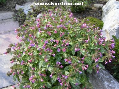 Staronová trvalka s bíle skvrnitými listy a květy, které mění barvy od růžové k modré. Výška 30 cm. Kvete duben - květen. Rychle se rozrůstá.