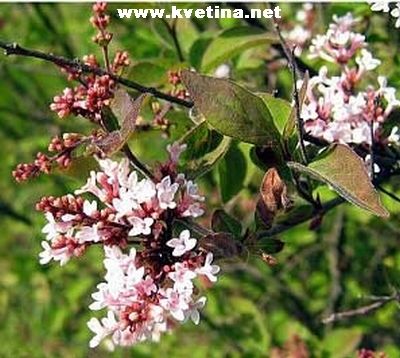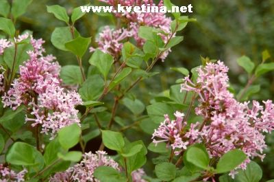 Syringa meyeri (Syringa palibiniana, microphylla) - Velmi atraktivní hustý, jemně stavěný keř, lze pěstovat i jako stromek. Výška i šířka do 1,2m. Listy elipčitě vejčit, temně zelené. Květy vonné, početné v 8cm dlouhé laty. Půda vlhčí, živná, propustná. Snáší přísušky, vedra a je mrazuvzdorný. Kvete květen - červen.