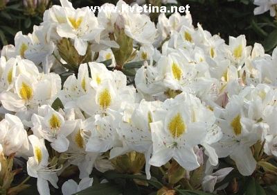 Rododendron, pěnišník - Rhododendron hybrid "Madame Masson". Atraktivní dřevina s nádhernými květy, které každé jaro ohromý svou jasnou barvou, stavbou květu a velikostí. Jsou stálezelené.Kvete květen-červen. Mírně kyselá a živná půda.(Rh. catawbiense x Rh. ponticum), květ: bílý se žlutým středem, vzrůst: hustý keř, v 10 letech 1,5 m, zimovzdornost: -26°C. Velmi oblíbený pro své nádherné leskle zelené husté olistění. Dobře nasazuje na květ.