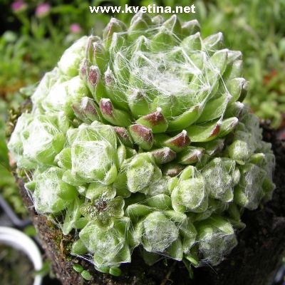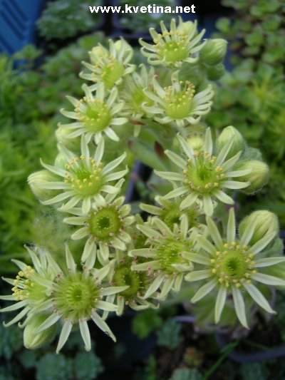 světle zelené ružice, stříbrně pavučinkové, žlutý květ *Smrzianum*