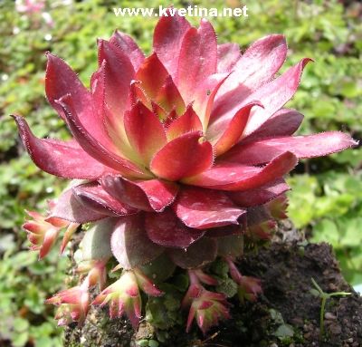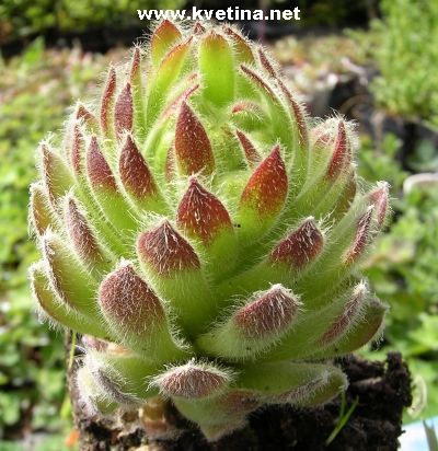 Netřesk - Sempervivum hybridum. Nízká tučnolistá skalnička. Pro slunná a suchá místa. Do skalek, zídek, koryt a střešních zahrad. Mimořádně nenáročné na pěstování. Výška 5 - 10cm. Kvete červenec - srpen.