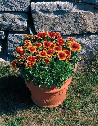 Kokarda - Gaillardia grandiflora "Arizona Sun". Roste v trsech, velké květy 10cm. Obruby, koryta, skalky. Překrásná, zářivá, tříbarevná trvalka. Výška 30cm. Kvete květen - říjen.