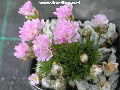 Armeria caespitosa (juniperifolia) - Trávnička. Úhledné kopečky hustě shloučených trávovitých listů. Vhodná do skalek, obruby, koryta. Kulovité květenství na stonku složené z papírových květů. Kvete květen - červenec. Vyžaduje propustné a slunné půdy.. Výška do 10cm.