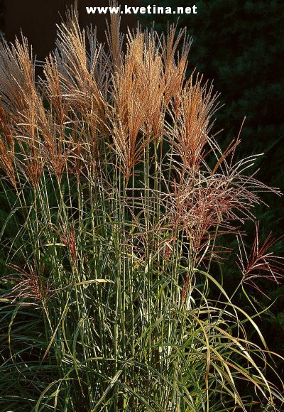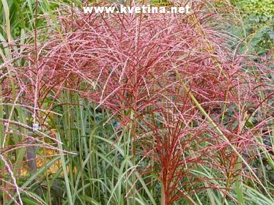 Ozdobnice čínská - Miscanthus sinensis "Rotsilber". Vysoká, hustě trsovitě rostoucí tráva. Listy mají uprostřed stříbrný pruh a mohou být od konce červeně zbarvené. Květy jsou na zelených až vínově červených stéblech zakončených červenostříbrnými latami, které jsou hned nad listy. Výška 150 - 200 cm. Kvete září - říjen. Seřezáváme až na jaře, jinak hrozí vyhnívání rostliny.