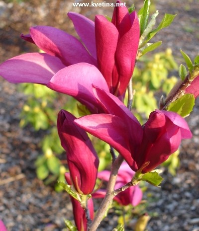Šácholan Susan - Magnolia "Susan". Květy mají tvar polorozevřených lilií nebo štíhlých tulipánů, navenek sytě růžové až červené, se světlejším vnitřkem. Jedná o nejsytěji zbarvenou odrůdu. Kvete na koncích loňských větví, velmi bohatě již jako mladý keř. Keř s hustým olistěním, svěže zelenou barvu. Umístění na vlhkých, mírně až velmi kyselý půdách. Plné slunce nebo v lehký polostín. Je plně mrazuvzdorná. Díky velkým květům a listům ocení stanoviště chráněné před ostrým větrem a zamulčování kořenů, aby neztrácela vlhkost v žádném ročním období. Výška 1,5 - 3 m. Kvete duben - květen. Vhodná kyselá reakce půdy. Minimální řez.