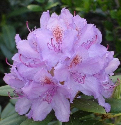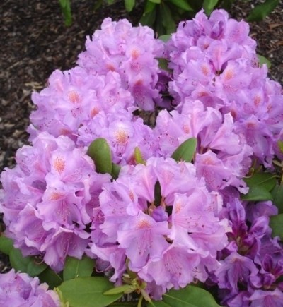 Rhododendron catawbiense "Grandiflorum" - Rododendron, pěnišník. Patří ke známým a oblíbeným druhům. Má vzpřímené trsy květů sytě levandulové barvy s červeným tečkováním. Roste poměrně rychle a dokáže přerůst 2m. Toleruje plné sluce a vítr.