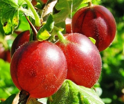 Ribes uva-crispa 'Hinnonmaki red'. Keřový angrešt speciálně vyšlechtěný s odolností proti americkému padlí. Velké červené a chutné plody.