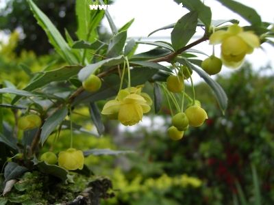 Listy červené až purpurové, výhony červené. Květy ve svazečcích žluté až červené.Plody červené do zimy. Daří se v každé půdě. Kvete květen.Výška do 1,5m-velmi dobře snáší řez a odnožuje.